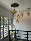 Lustre pendente Sarvah moderno com 6 globos de vidro âmbar, ideal para escadas e ambientes com pé direito duplo ou alto. Lustre pendente Sarvah moderno com 6 globos de vidro âmbar, ideal para escadas e ambientes com pé direito duplo ou alto.