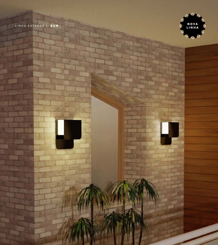 Sun: Produzida em alumínio com pintura eletrostática e acrílico, a arandela SUN pode ser utilizada tanto na área interna quanto na área externa. Com um prático sistema de instalação e manutenção, a SUN traz praticidade e modernidade alinhado com um efeito de iluminação que destaca a luminária e o ambiente.