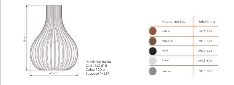 A estrutura possui Ø40cm de Diâmetro, 54cm de Altura e enviamos um cabo de 120cm para que você possa instalá-lo perfeitamente. O material utilizado no Pendente Balão é Madeira Natural Multilaminada.