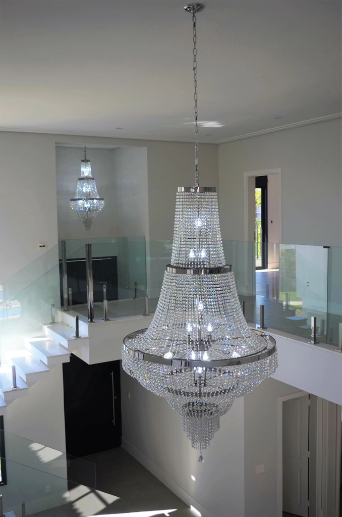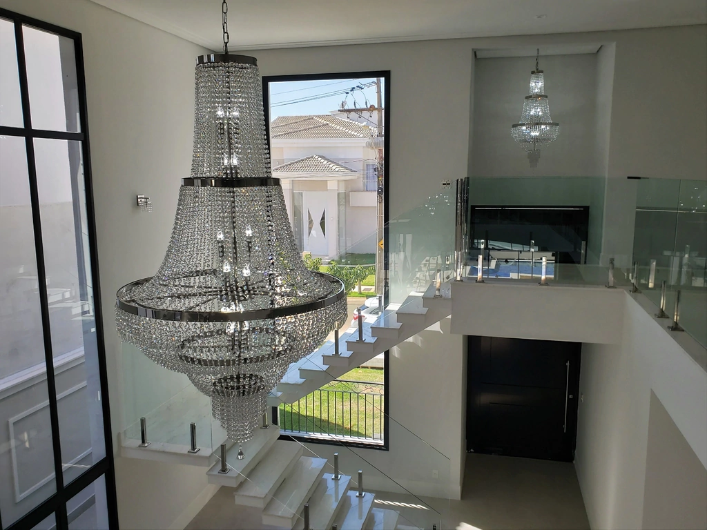 Indicamos o Lustre Riviera para Sala de Jantar, Sala de Pé Direito Duplo, Escadas, Lojas e Buffet.