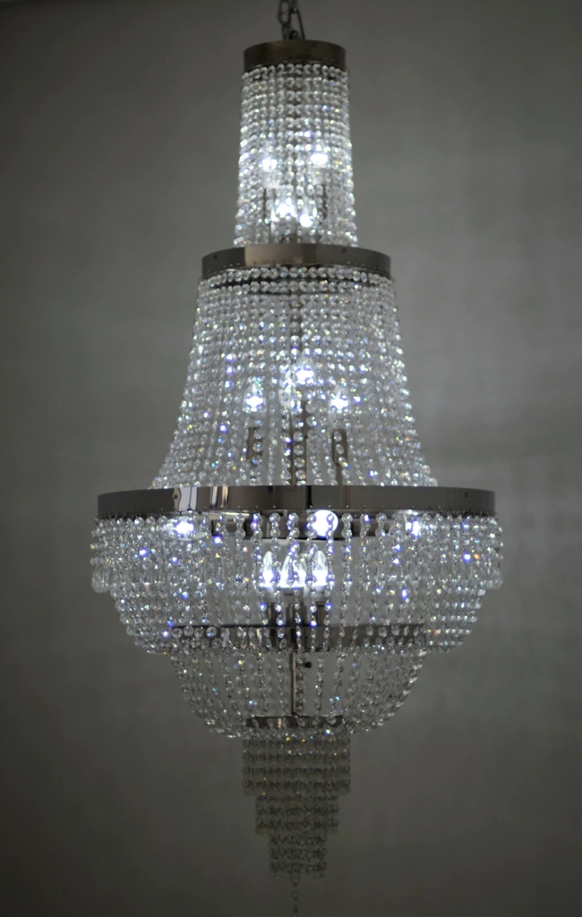 Desenvolvemos o Lustre Riviera com cristais na cor Transparente, sendo utilizado 3.900 Castanhas de 14mm e 65 Pirulitos de 36mm.