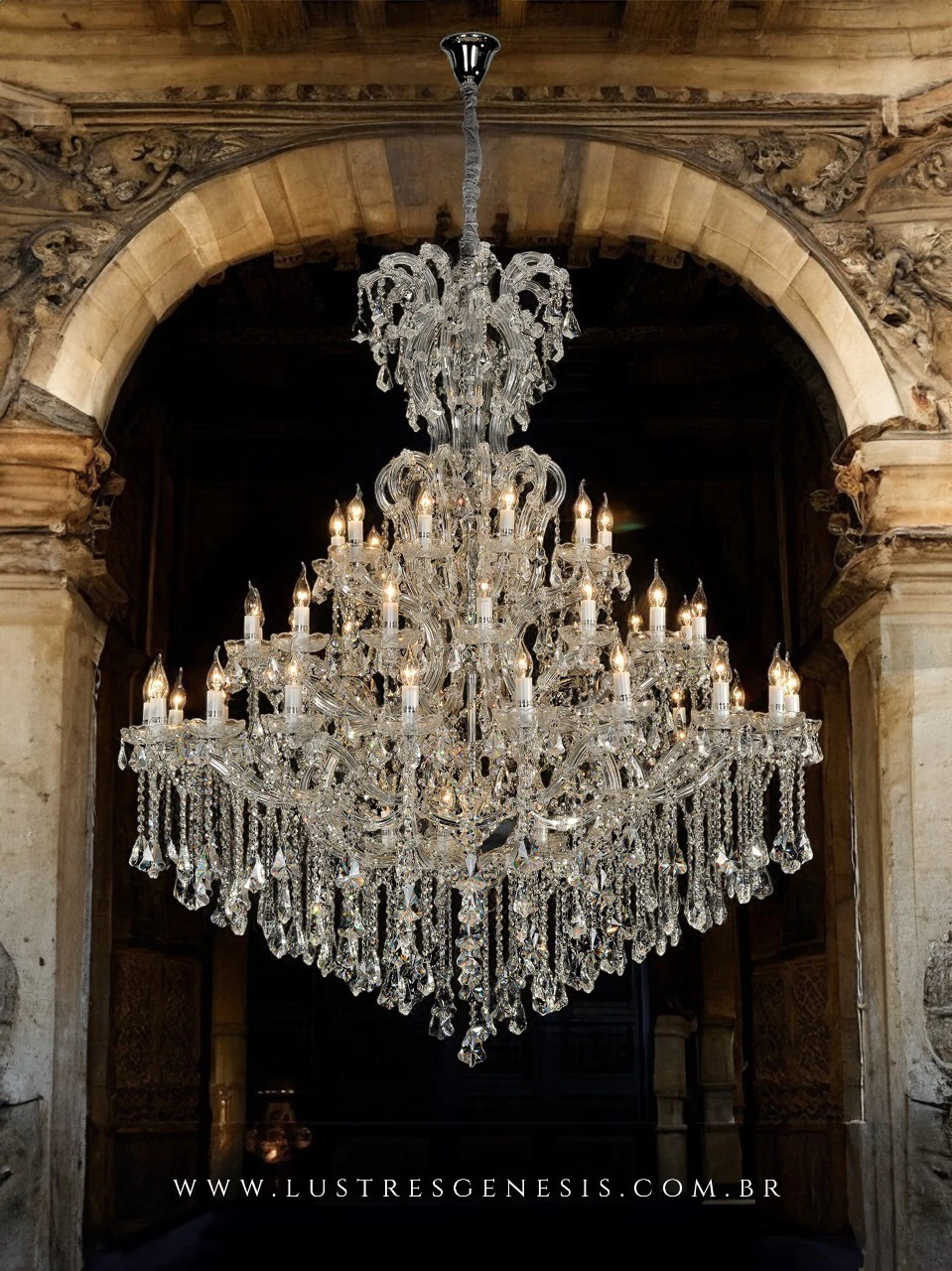 Sua Estrutura já com os Cristais possui 50 Braços tendo a dimensão Ø150cm de Diâmetro, 180cm de Altura e enviamos uma corrente de 1,00m conforme sua necessidade para instalar o lustre perfeitamente. São utilizadas 50 Lâmpadas E-14 no Lustre Santiago.
