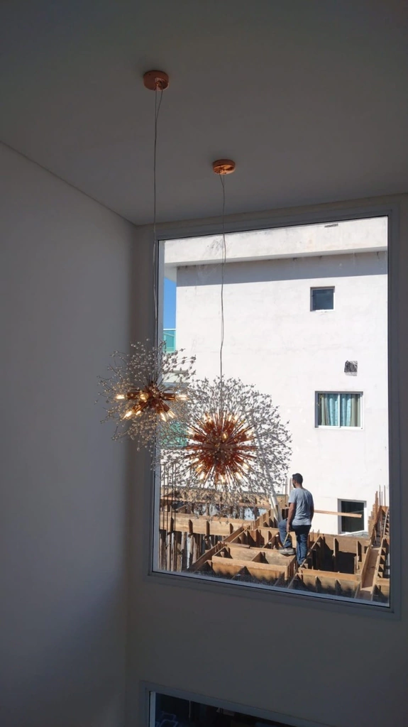 A dimensão do Lustre Pendente Sunshine tem 2m de Cabo e seu Diâmetro Ø80cm.