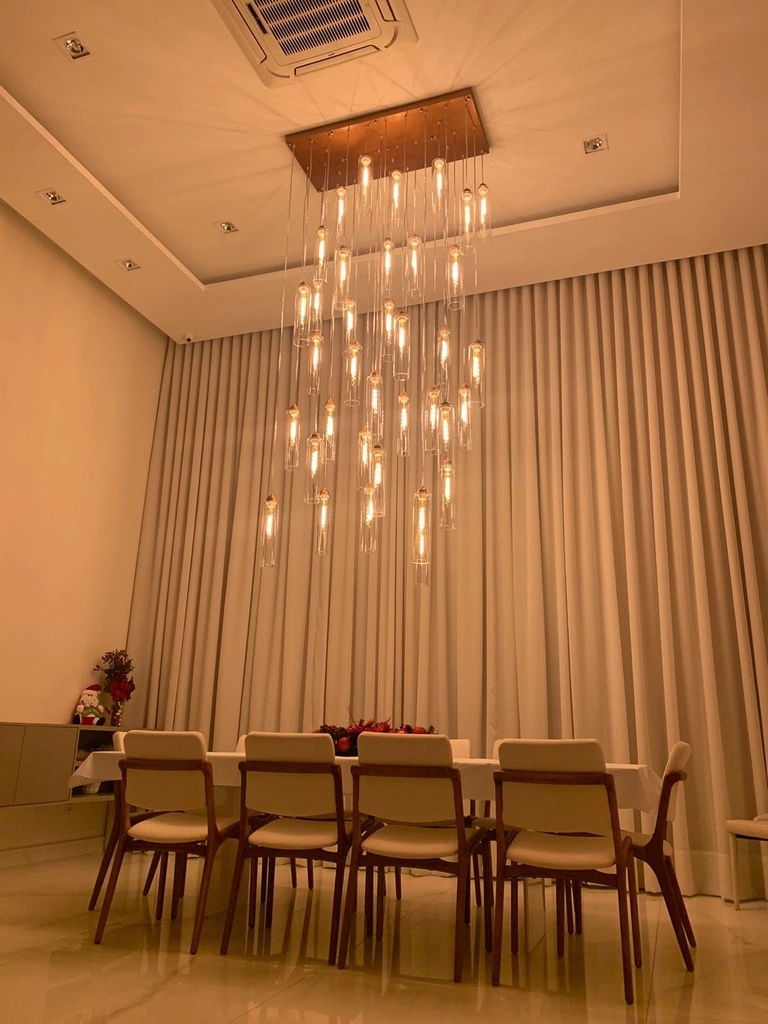 A altura do Lustre Dunáh varia de acordo com a necessidade do ambiente. Deixamos a critério do cliente, nas alturas de 3,00 a 4,50m mantendo sua proporcionalidade e design.