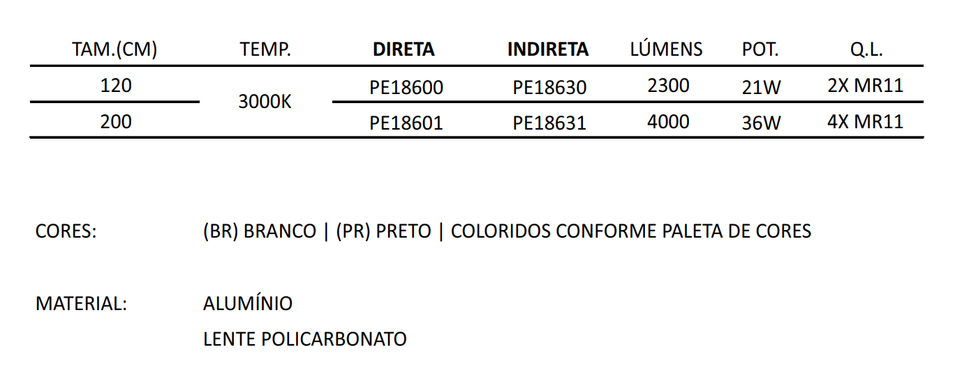 Possui iluminação fixa de 3000k Branco Quente sendo Direta ou Indireta, 21w de Potência com 2300Lm de Lúmens e 2 Lâmpadas Mr11