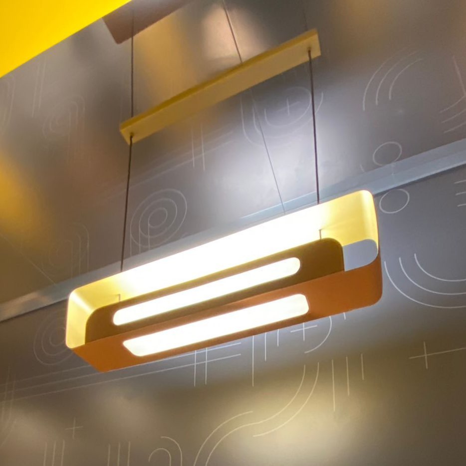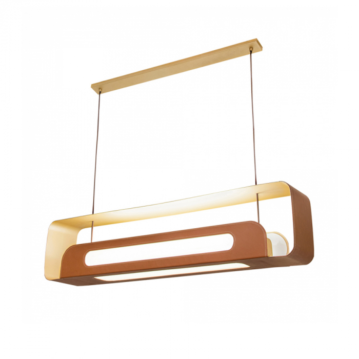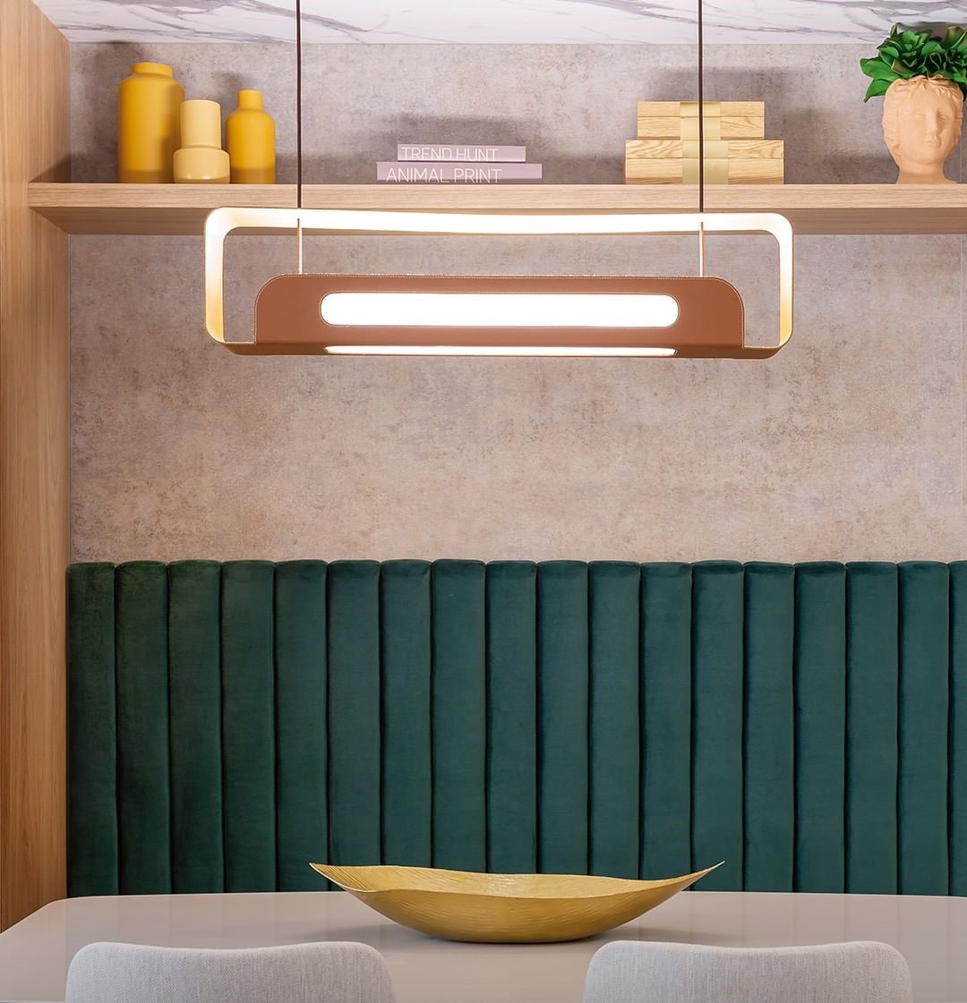 Magno: Magnífico e imponente. O pendente Magno se destaca por seu design e acabamento inovadores. Inspirando na geometria clássica ele é linear e sua estrutura em alumínio envolve de modo sinuoso a lâmpada. O revestimento em couro é inovador na iluminação e traz luxo, sofisticação e exclusividade ao modelo. Assinado por Studio Muncalir e SENAI Design.