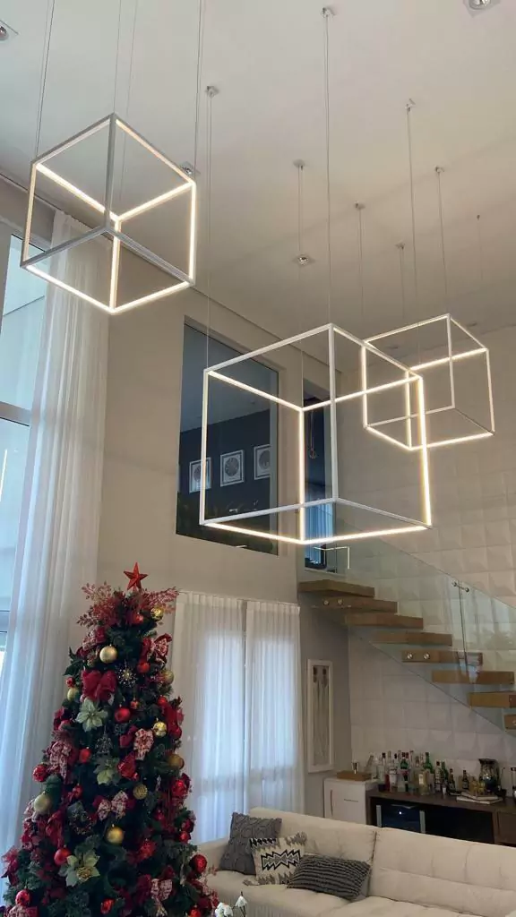 Disponibilzamos o Lustre Pendente Risk também nas medidas: 70x70cm com duas opções de iluminação fixa de 3000k Branco Quente e 4000k Neutro 140,4w de Potência com 15600Lm de Lúmens. 90x90cm com duas opções de iluminação fixa de 3000k Branco Quente e 4000k Neutro 183,6w de Potência com 20400Lm de Lúmens