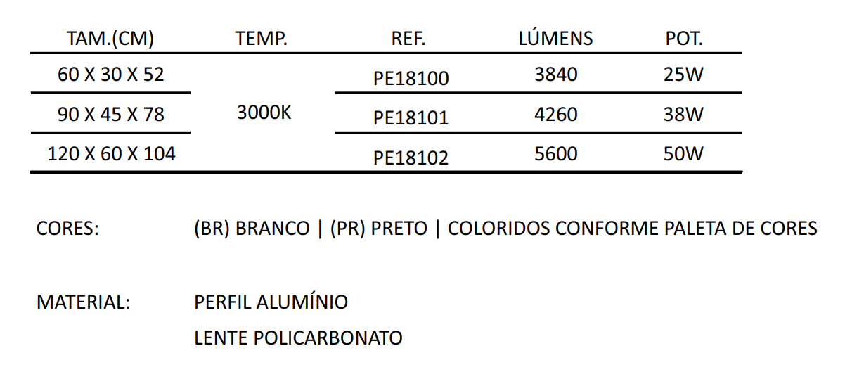 Material: Alumínio, Perfil e Lente Policarbonato