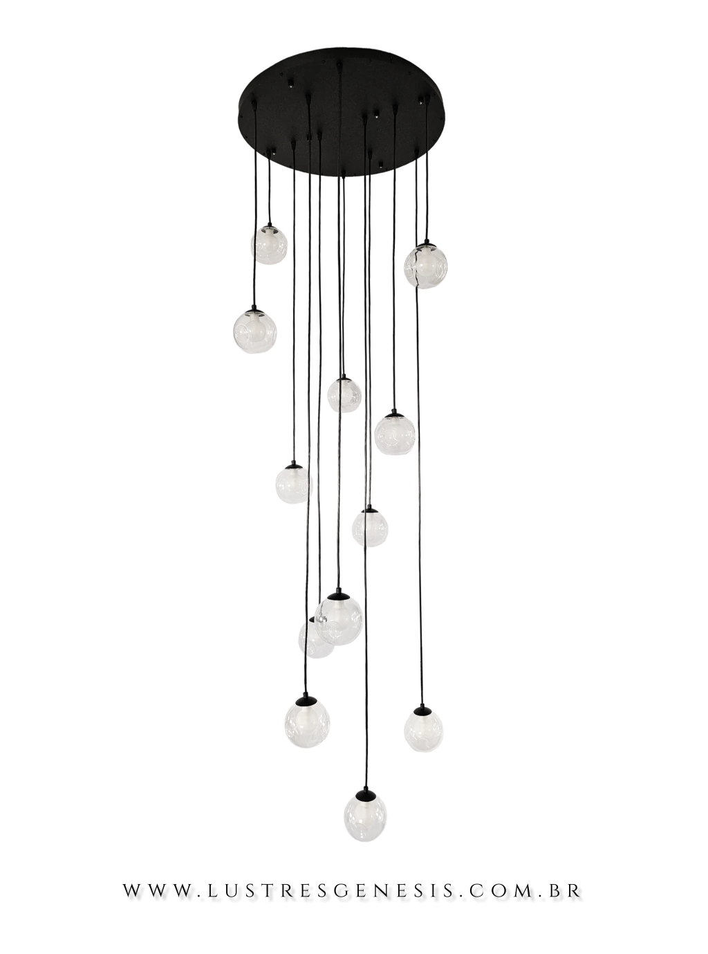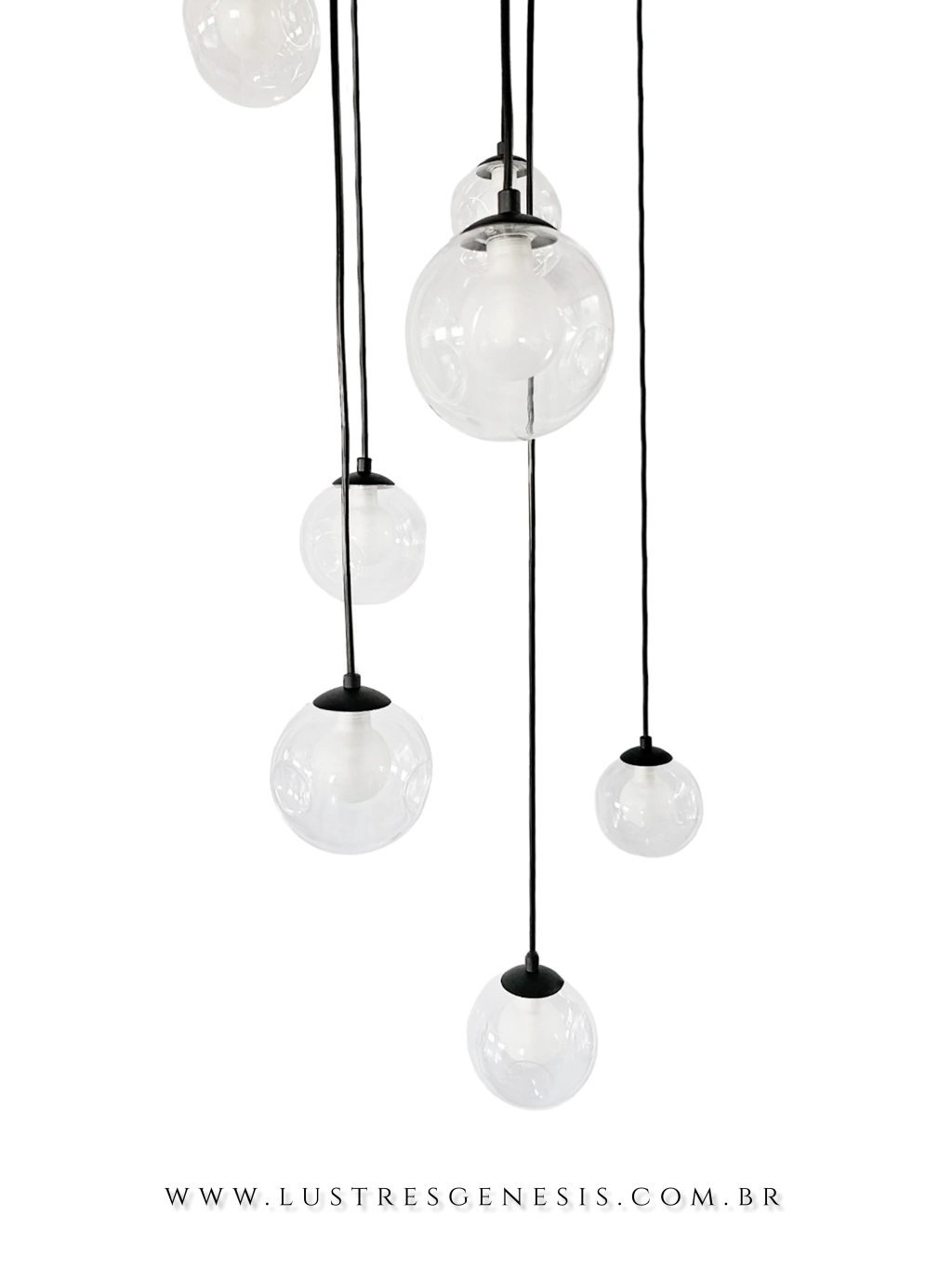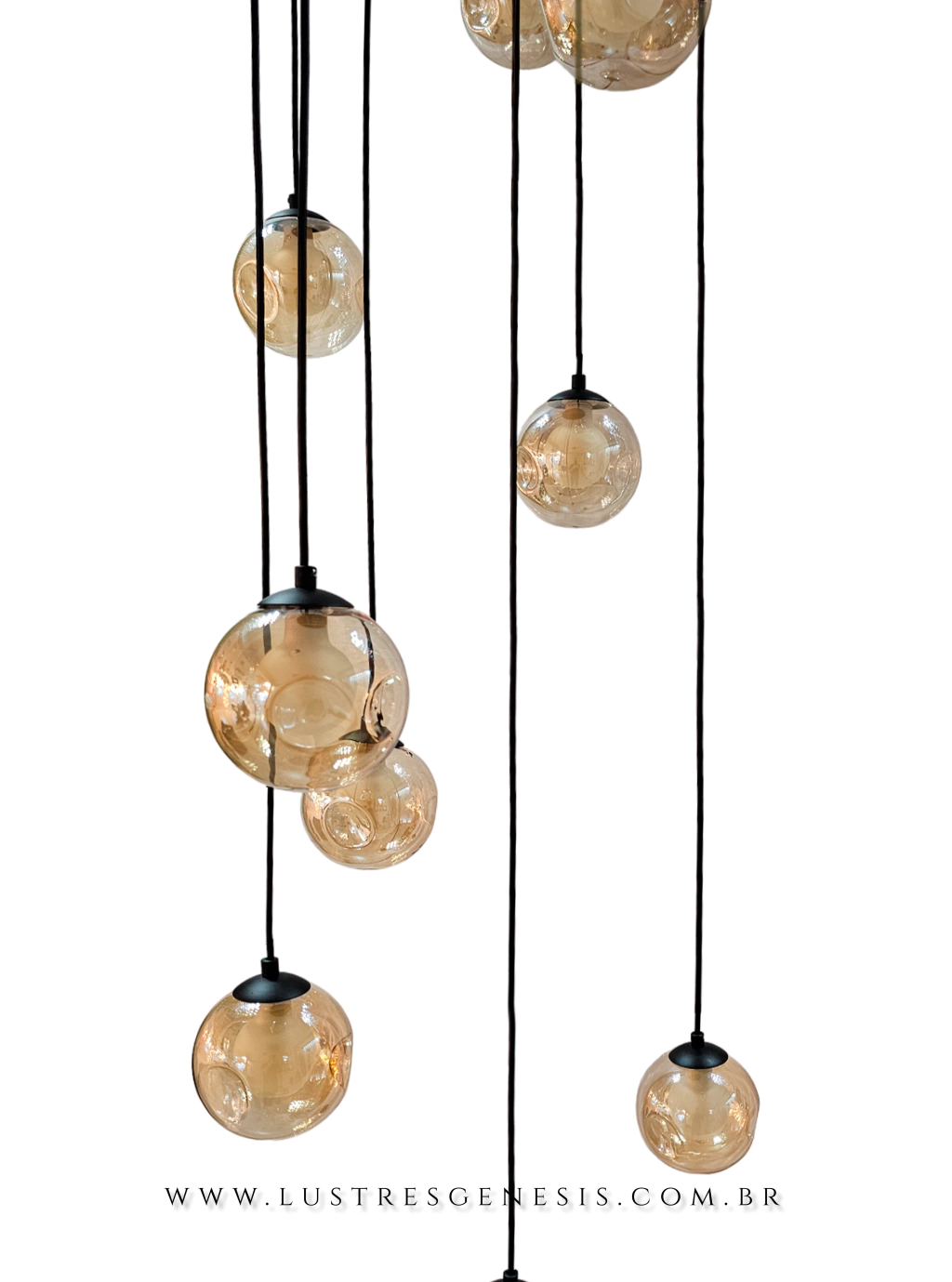 Desenvolvido com 12 Globos de 12cm de diâmetro nas tonalidades: Fumê, Transparente ou Conhaque ideal para ambientes Pé Direito Duplo - Pé Direito alto - Escadas e Hall de Entrada.