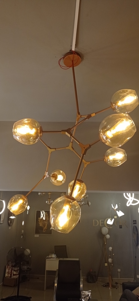 O Lustre Orbe Dourado é desenvolvido com Vidro e Metal, Trazendo um toque totalmente novo para seu ambiente. A altura do Lustre Orbe Dourado é de 1,00m e o diâmetro de 1,50m contendo 9 Lâmpadas.
