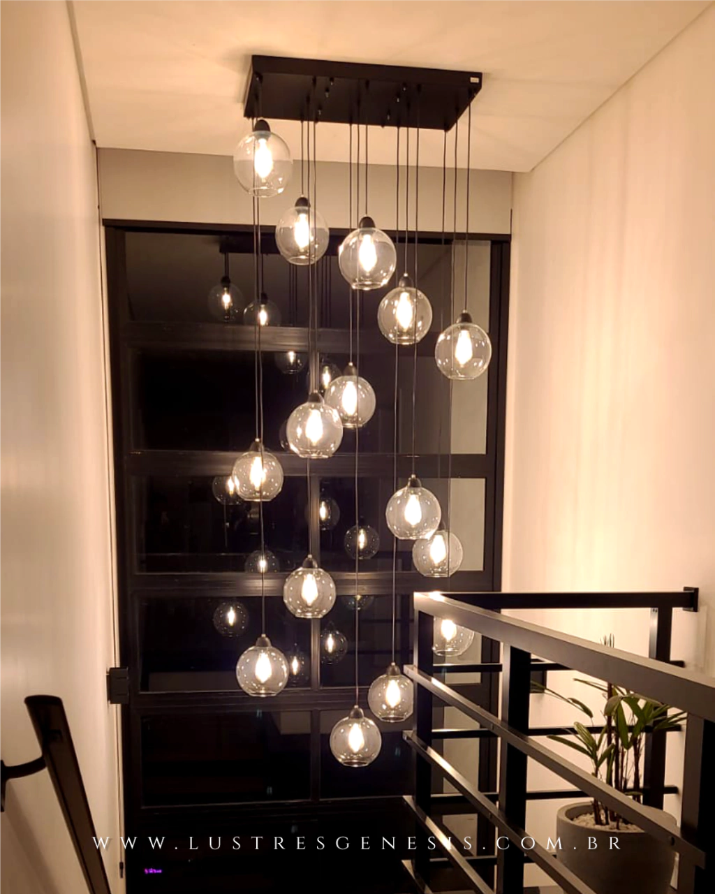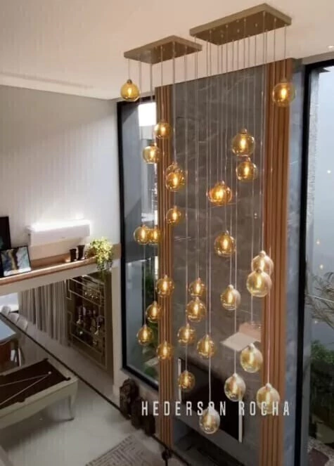 Desenvolvido com 15 Globos de 21cm de diâmetro nas tonalidades: Fumê, Transparente, Âmbar ou Fumê Espelhado (Importado) ideal para ambientes Pé Direito Duplo - Pé Direito alto - Escadas e Hall de Entrada.