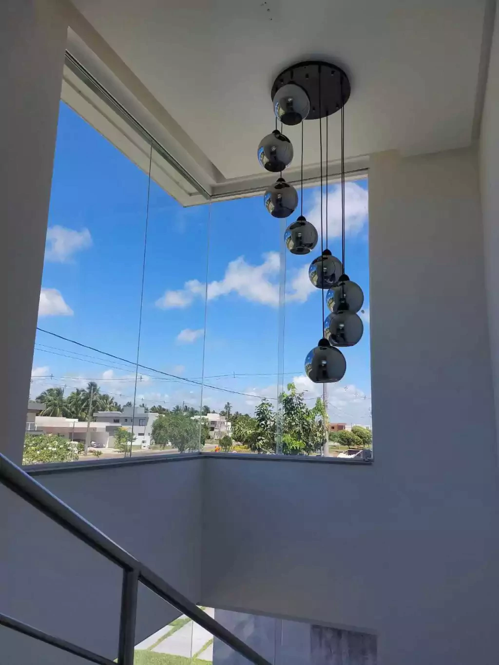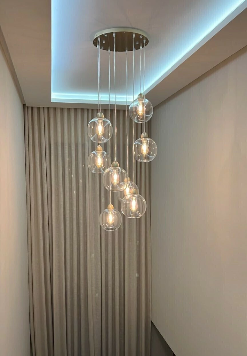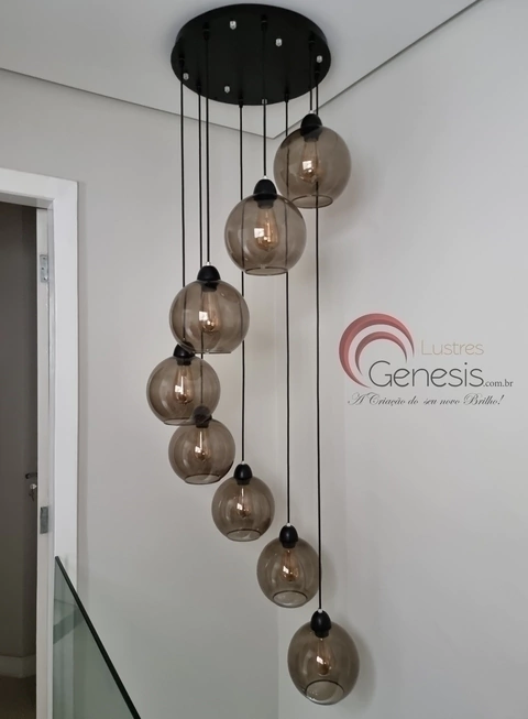 Desenvolvido com 8 Globos de 21cm de diâmetro nas tonalidades: Transparente, Fumê, Âmbar ou Fumê Espelhado (Importado) ideal para ambientes Pé Direito Duplo - Pé Direito alto - Escadas e Hall de Entrada.
