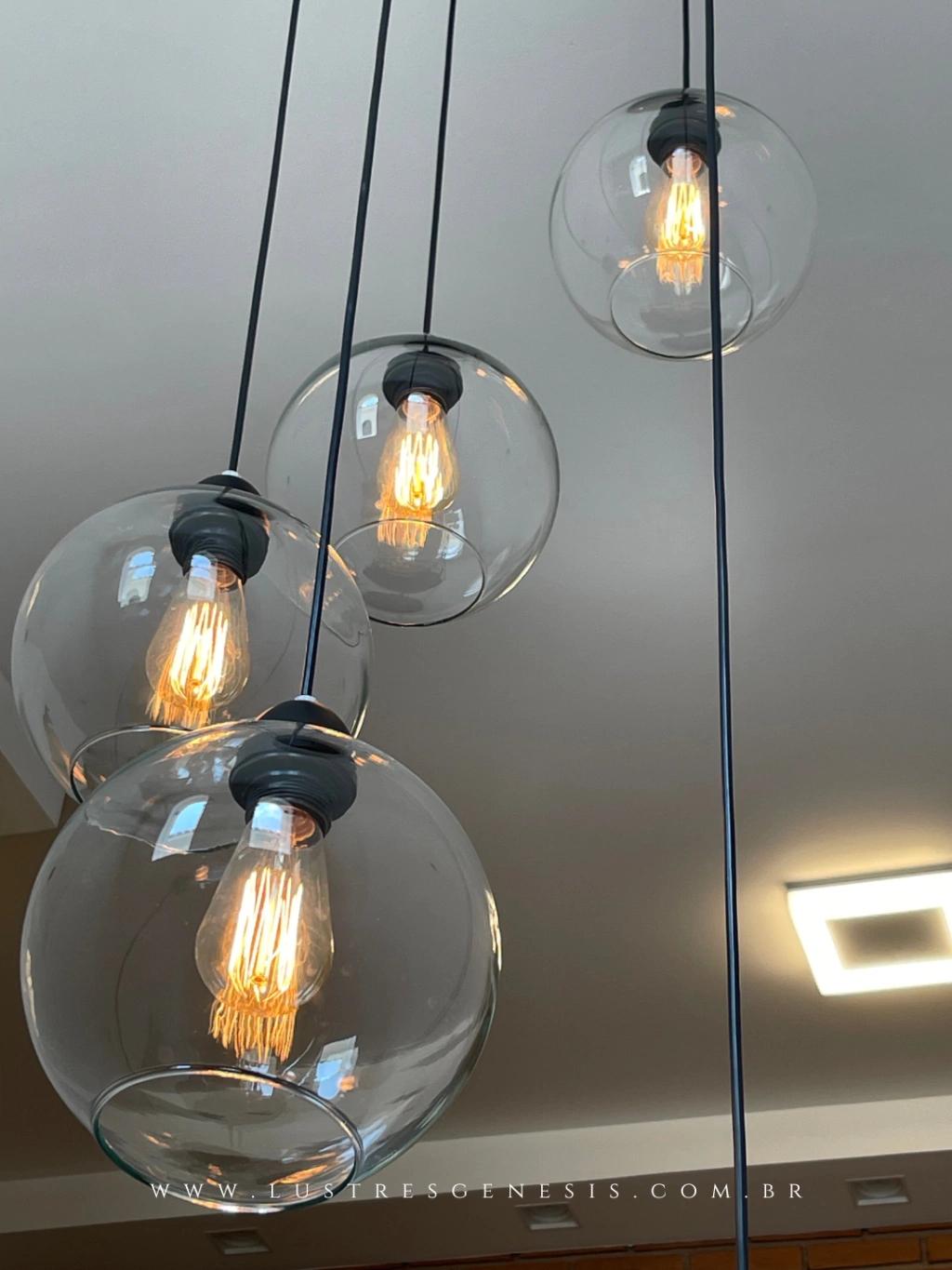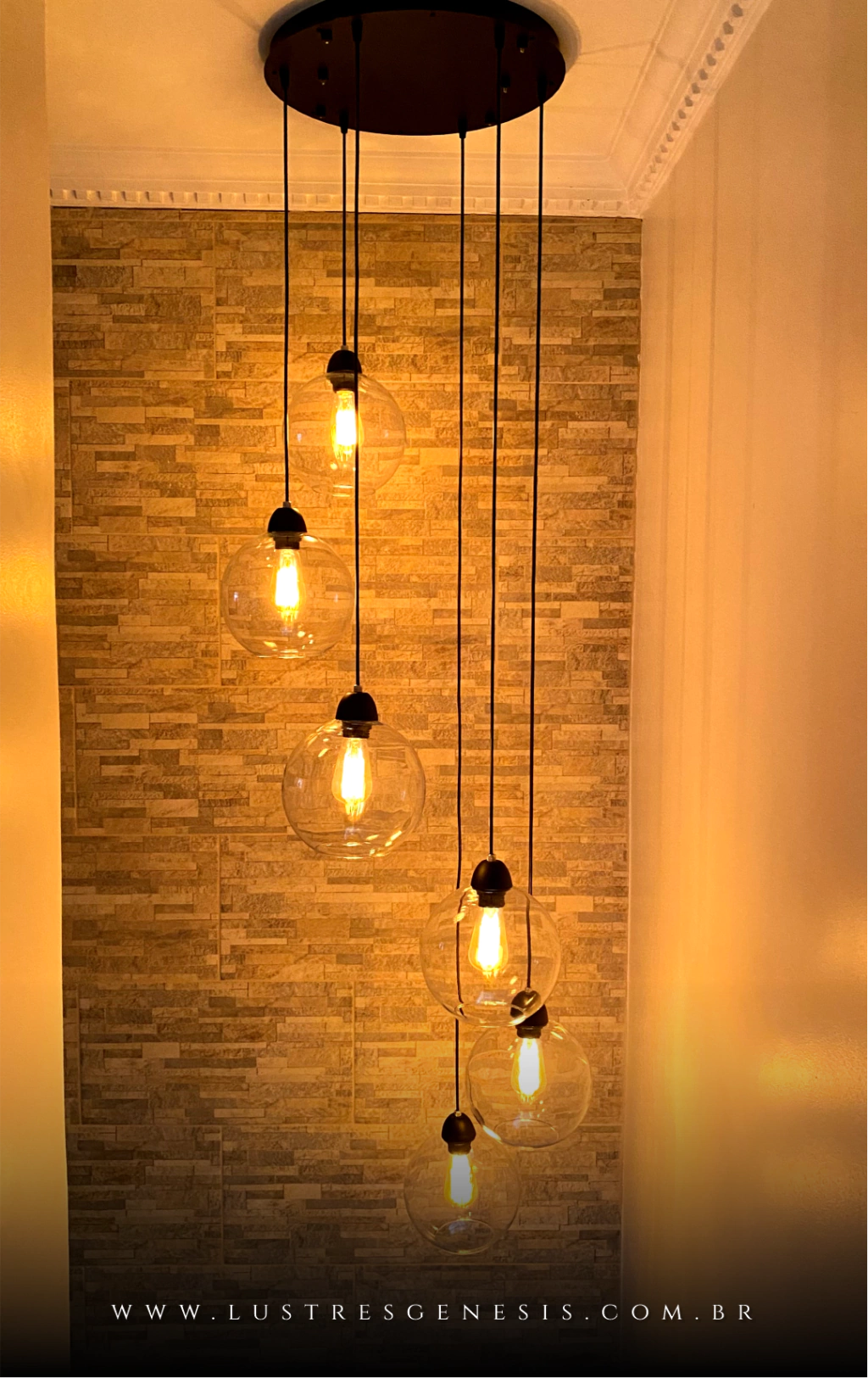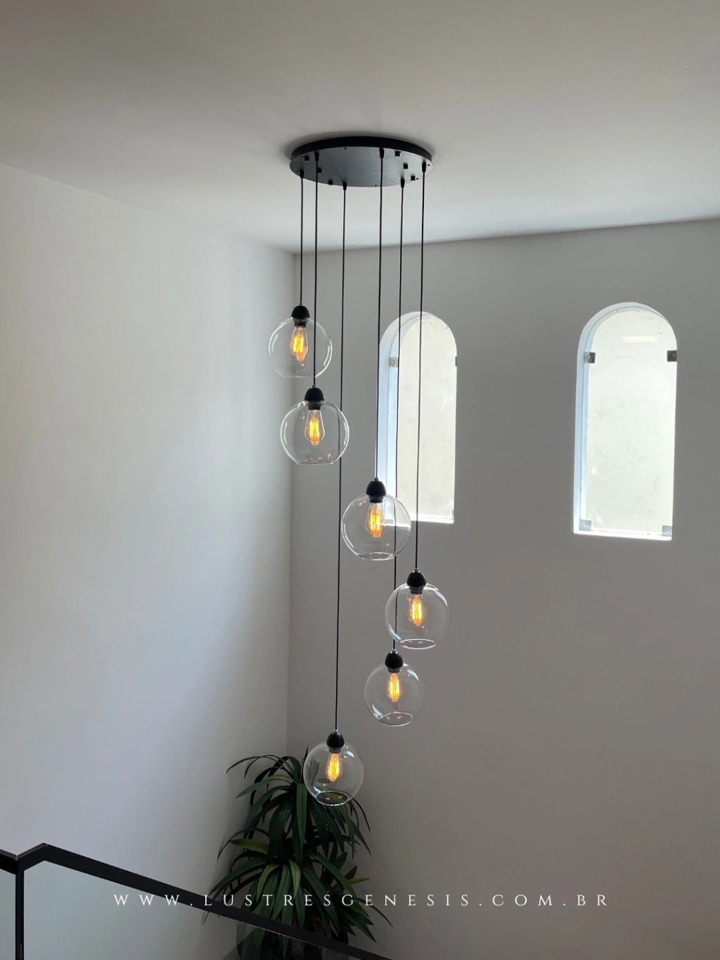 Desenvolvido com 6 Globos de 21cm de diâmetro nas tonalidades: Transparente, Fumê, Âmbar ou Fumê Espelhado (Importado) ideal para ambientes Pé Direito Duplo - Pé Direito alto - Escadas e Hall de Entrada.
