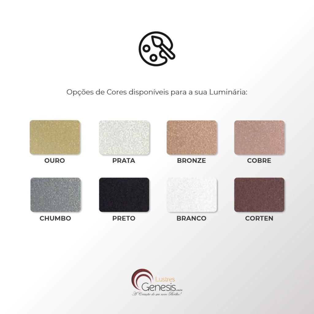 Cores: Cobre Rose Gold, Ouro, Preto, Bronze, Chumbo, Preto, Branco e Corten.