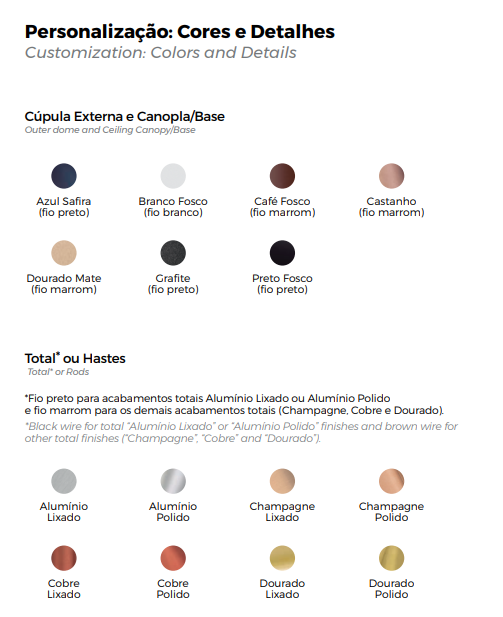 Cores da Cúpula: Branco Fosco, Preto Fosco, Dourado Mate, Azul Safira, Castanho, Grafite e Café Fosco