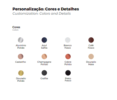 Cores: Dourado Mate, Alumínio Lixado, Azul Safira, Branco Fosco, Café Fosco, Castanho, Champagne Lixado, Cobre Lixado, Grafite e Preto Fosco