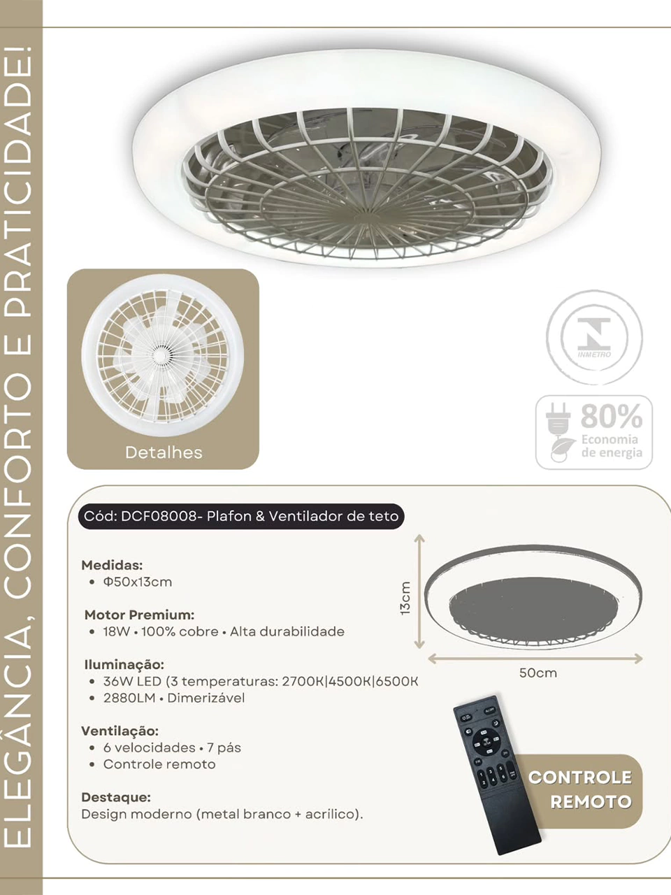 O Plafon Ventilador traz conforto e praticidade com um toque de modernidade. Hélice retrátil transparentes, design aerodinâmico para máximo fluxo de ar, contendo 3 opções de iluminação: Branco Quente, Neutro e Frio para criar um ambiente perfeito e controle remoto para total comodidade.